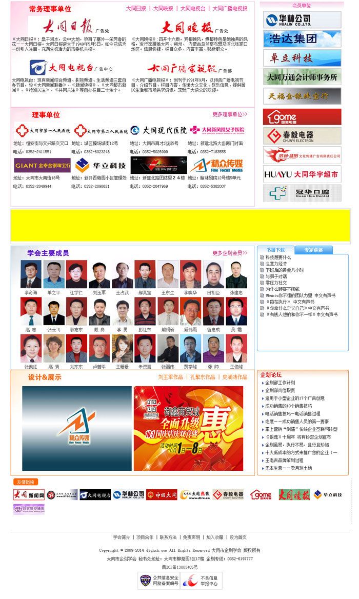 大同市企劃學(xué)會(DESA)是經(jīng)山西省大同市民政局、社科聯(lián)審批注冊成立的地區(qū)性企劃組織、具有獨(dú)立法人資格的非營利性社會團(tuán)體。2008年末開始籌備,2009年3月初正式注冊成立。是集合我市主流媒介、企業(yè)經(jīng)營管理者、商業(yè)策劃者、理論研究者等四個層面為一體的一個溝通交流、相互