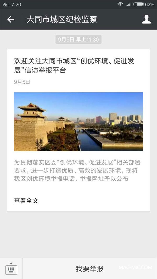大同市城區(qū)紀(jì)檢監(jiān)察“創(chuàng)優(yōu)環(huán)境、促進(jìn)發(fā)展”微信公眾服務(wù)平臺由大同微網(wǎng)站建設(shè)公司宏微信息技術(shù)設(shè)計制作,通過舉報平臺可以在線舉報、查詢城區(qū)在創(chuàng)優(yōu)環(huán)境方面存在的問題和建議,掃描以下二維碼可以關(guān)注。