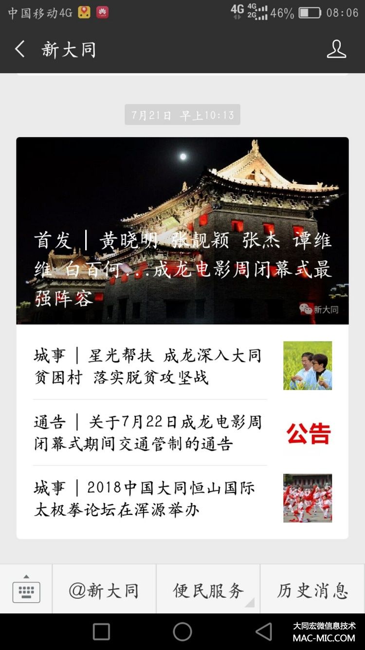 7月21日,由宏微信息技術(shù)旗下新大同微信平臺(tái)首發(fā),新大同網(wǎng)、今日頭條新大同號(hào),搜狐新大同號(hào)等全媒體陣容推出的《首發(fā) | 黃曉明 張靚穎 張杰 譚維維 白百何...成龍電影周閉幕式最強(qiáng)陣容》一文在網(wǎng)絡(luò)一經(jīng)推出就開始熱傳。成龍電影周在大同舉辦,閉幕式廣受關(guān)注,新大同內(nèi)容發(fā)送及時(shí),內(nèi)容獨(dú)特,編排新穎,受到眾多關(guān)心大同旅游發(fā)展、關(guān)系成龍動(dòng)作電影節(jié)的網(wǎng)友一致好評(píng)。
