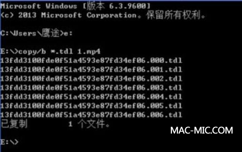 然后使用WIN圖標(biāo)鍵+R ,打開(kāi)cmd ,輸入 e: 按下回車進(jìn)入e盤(pán) ,然后輸入:copy/b *.tdl 1.mp4 對(duì)E盤(pán)下所有tdl格式的文件進(jìn)行合并。