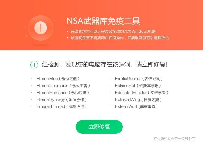 如果沒(méi)中毒,立即下載NSA武器庫(kù)免疫工具打補(bǔ)丁加固系統(tǒng),并下載文檔衛(wèi)士備份文檔