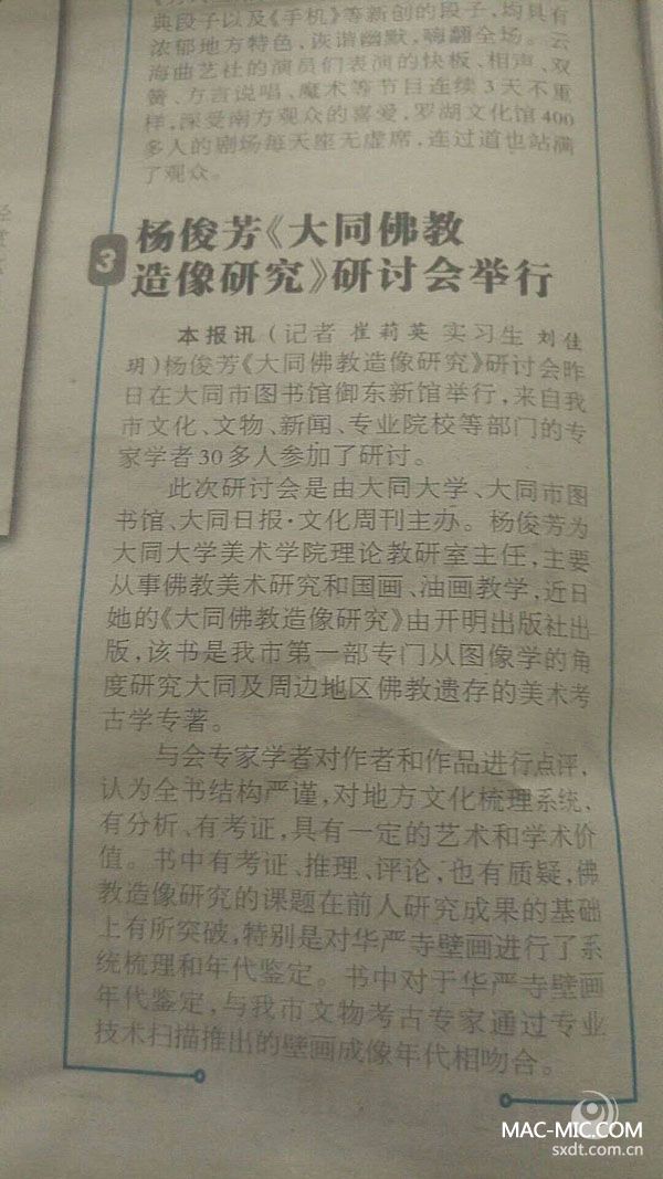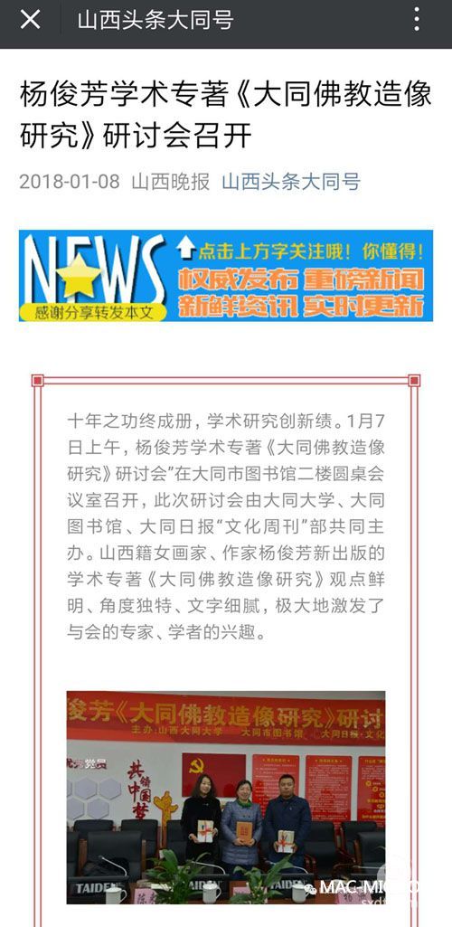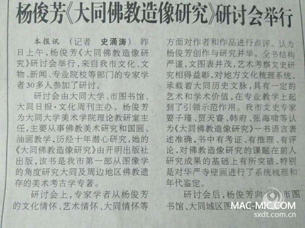十年之功終成冊(cè),學(xué)術(shù)研究創(chuàng)新績(jī)。2018年1月7日,伴隨著大同入冬以來(lái)的第一場(chǎng)瑞雪,楊俊芳的學(xué)術(shù)專著《大同佛教造像研究》作品研討會(huì)在大同市圖書館召開,本次活動(dòng)由大同大學(xué)、大同市圖書館、大同日?qǐng)?bào)·文化周刊共同主辦。來(lái)自大同大學(xué)、大同市文化界、學(xué)術(shù)界的眾多專家、學(xué)者、作家40余人共聚一堂,就該作品進(jìn)行了研討。新大同網(wǎng)應(yīng)邀參加了本次會(huì)議。