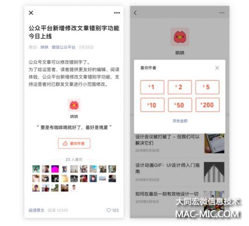 據(jù)了解,此次更新后,公眾號贊賞功能升級為“喜歡作者”,開啟了贊賞的文章在原創(chuàng)文章底部有“喜歡作者”的入口。在 iOS 版和 Android 版微信上都可以使用。有邀請權(quán)限的公眾號在“贊賞功能”里填寫微信號發(fā)送創(chuàng)建邀請。通過公眾號的邀請,進入“贊賞賬戶”小程序填寫信息,即可完成創(chuàng)建。