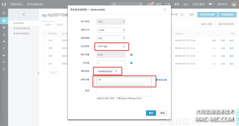 如果您的本機網(wǎng)絡支持 IPv6,可以為該實例 開通 IPv6 網(wǎng)關公網(wǎng)帶寬,然后直接在本地瀏覽器里輸入 http://[your_ipv6_address] 即可訪問, 需要注意在該實例的安全組里配置 IPv6 入方向 80 端口。如下圖所示: