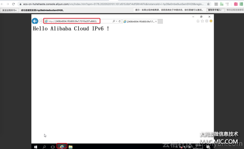 筆者由于本地網(wǎng)絡不支持 IPv6,因此又用上述步驟購買了另一臺 Windows 實例(配置好 IPv6),然后通過 VNC(控制臺遠程連接)連接該實例,然后通過瀏覽器訪問上述第 7 步部署的 Web 服務,如下圖所示: