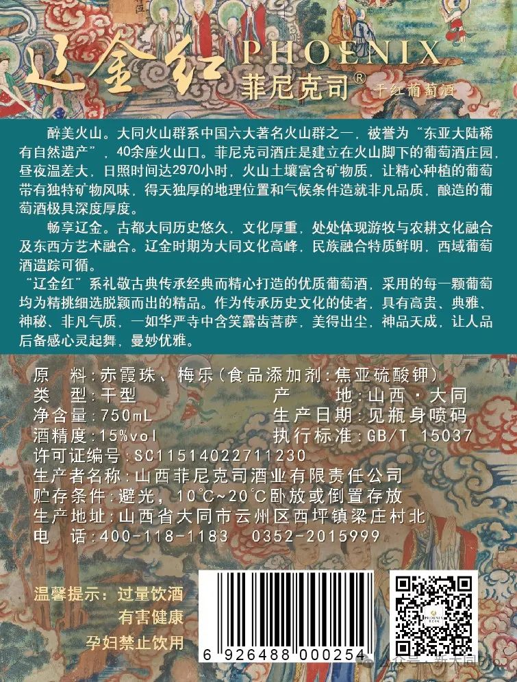 遼金時期為大同文化高峰之一,民族融合特質(zhì)鮮明,西域葡萄酒遺蹤可循。“遼金紅”系禮敬古典、傳承經(jīng)典而精心打造的優(yōu)質(zhì)葡萄酒,作為傳承歷史文化的使者,“遼金紅”具有高貴、典雅、神秘、非凡氣質(zhì),一如遼金古剎華嚴(yán)寺中含笑露齒菩薩,美得出塵,神品天成,讓廣大游客通過舌尖更能深入體驗古都大同厚重魅力。